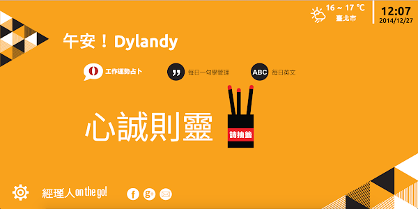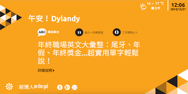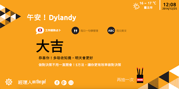 輸入姓名與地區之後,就會看到每日一句學管理,為認真工作的自己加油打氣。