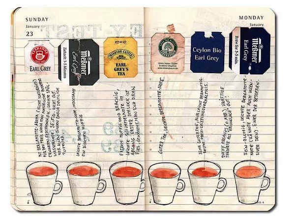 如果給每一頁筆記賦予一個主題,你會不會圍繞它開始做各類的收集呢?比如喝過的不同類型的茶的標籤,把他們組合到一起貼起來,就有如下的驚艷效果: