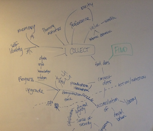 在紙張的正中心寫上核心要點,然後以此開始做發散,可以是腦力激盪,也可以是自我對話。這種演繹法可以非常直觀找出與你關心的「中心」相關的所有因素。下圖為開會時的白板,相信大家討論時都會留下發想紀錄,開完會之後記得拍張照 send 給大家,這樣每個人都有個行動依據。