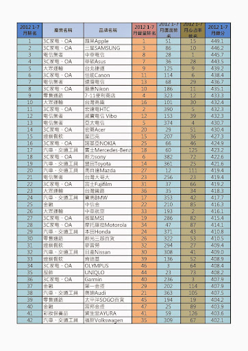 蘋果為2012年影響力品牌TOP 200第一名,也是8月份品牌影響力指標冠軍。能持續地穩定蟬聯影響力最大的品牌,在於蘋果知名度高、討論聲量巨大,其討論篇數比其他品牌高出3倍到數倍之多。此外,在iPhone5即將推出之際,蘋果不斷發布產品訊息;日前更成為美國史上市值最高的公司,自2009年1月以來股價上漲近七倍,引發大量討論及注目。