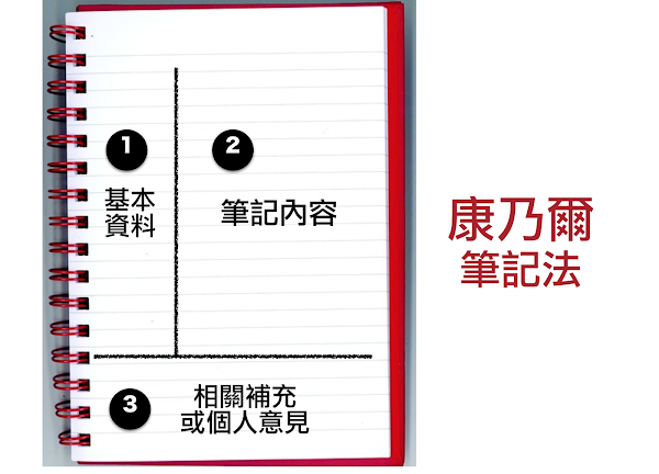 康乃爾筆記法(Cornell Method)是由美國康乃爾大學發展出來的筆記技巧,最大特色就是:把兩條線,以「歪基心的倒T字」組合,將版面切割為「一大兩小」3部分:左方小區塊用以記錄日期、主題、與會者等基本資料,右方大區塊用做記錄內容的主要範圍,下方區塊則做為補充資訊或個人想法的記錄區。