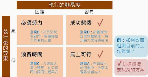 為了加強會議的效率與產出,日本企業管理顧問宇井克己指出,開會時可能產生許多建議,一時之間難以完成討論,因此應歸類並找出優先順序。他修改由奇異公司(GE)開發的矩陣,縱軸為效果高低、橫軸為執行難易度,由參與的大家共同把建議歸類至適當的位置,以此讓工作規格化,也有助於了解彼此對意見的看法及順序,提高討論效率。