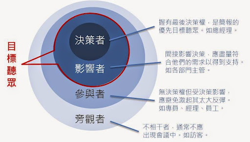簡報時,要以決策者、影響者為目標聽眾,考量他們的需求,並參考參與者可能受到的影響,忽略旁觀者,以達成最有效率的簡報溝通。