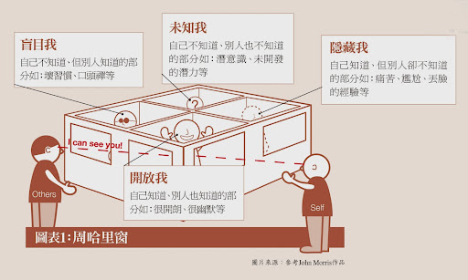 著名的心理學理論「周哈里窗」(Jehari Windows ),便可以用來分析這個狀況。陳朝益解釋,每個人的內心都有4個部分,其中「盲目我」的部分,是除非他人提醒或深刻反省,否則很難發現自己有某些行為,以及這些行為給別人帶來的困擾。