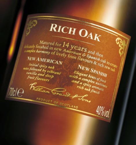 格蘭菲迪14年Rich Oak先在傳統橡木桶中熟成至少14年後,再將其部分放入全新美國橡木桶,部分放入全新西班牙橡木桶來進行過桶陳年,這是一項獨步蘇格蘭威士忌業界的創舉!