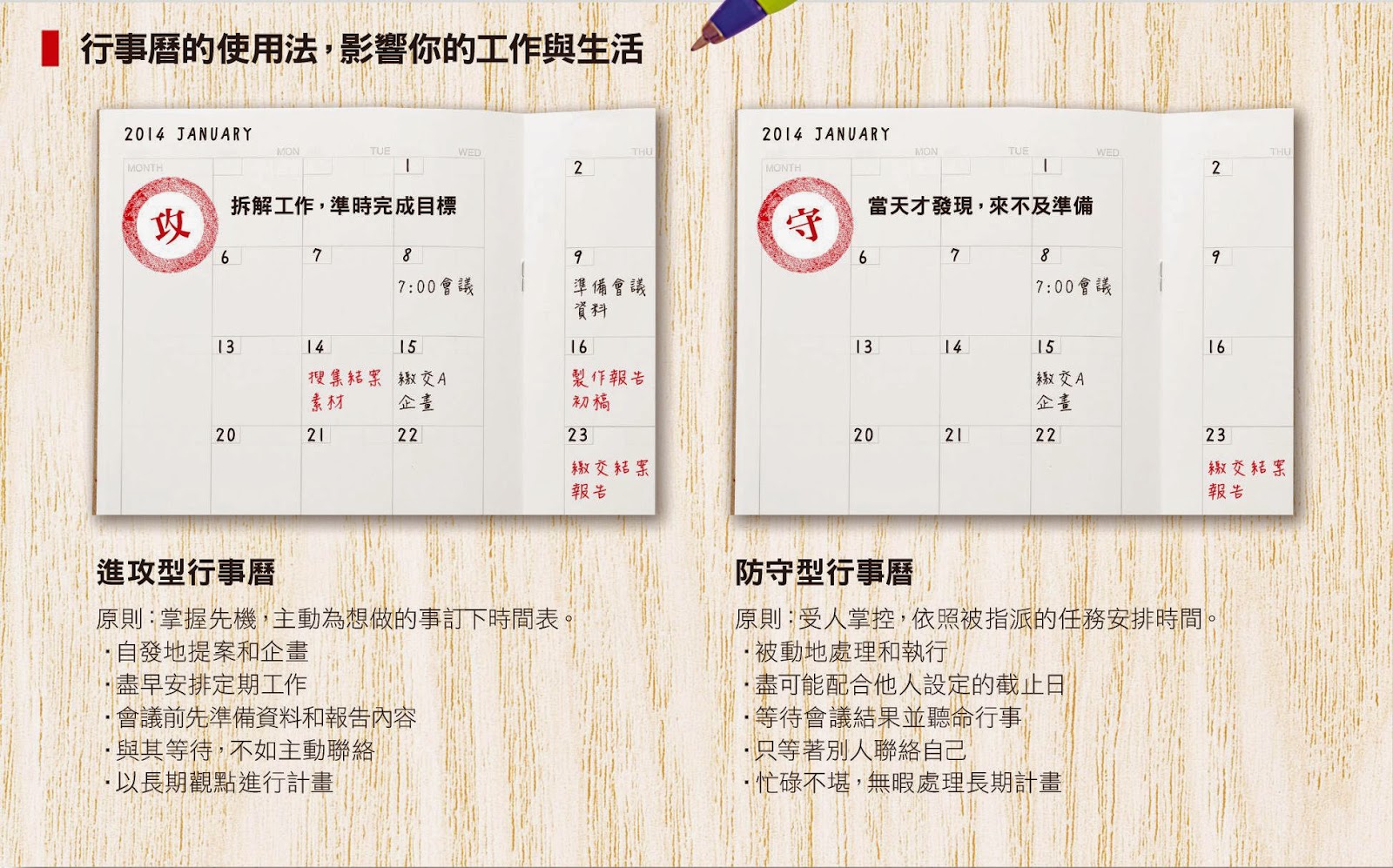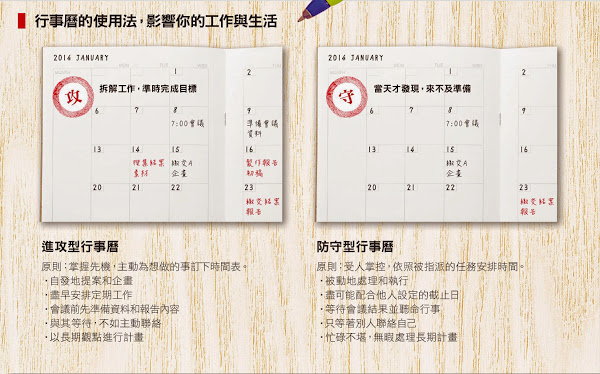 如果你是在公司有安排、老闆有規定、發生緊急狀況時,才將工作填進行程表中,這種行事曆使用方式就是神谷所稱的「防守型」;反之則是「進攻型」,能先觀察狀況、有所準備,再據此思考工作安排。