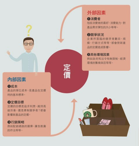 環境的因素必須考量,企業在定價之前,得先針對這些因素加以考慮與分析。影響新產品定價的因素,通常可分為「內部因素」和「外部因素」。(見圖表)