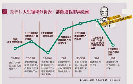 過去的經驗,如何應用在設定未來的人生目標上呢?《一枚A4工作術》建議,你可以回顧往事,畫出一張「人生循環分析表」(參見【圖表1】)。畫出圖形後,看著圖中的高低起伏,有6個重要的問題,可以自問自答,找出影響人生最重大的事件:「上升/下降時期的轉捩點,是因為什麼事?」「上升/下降時期的工作狀況如何?」「上升/下降時期與家人的關係如何?」「在各時期裡的目標是什麼?」「在各時期中,有效法的對象嗎?」「在各時期中,學到什麼知識與經驗?」