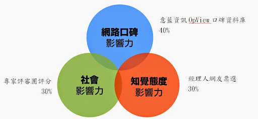 本次「經理人影響力品牌」的衡量可分為三個面向,一是網路口碑影響力:品牌是否能夠引起網友的討論聲浪、並且有正向的口碑評價;二是對消費者知覺態度的影響力:對消費者而言,其心目中最有好感的品牌為何;三是對社會、環境的外部影響力,有影響力的品牌,不只是有獲利的能力,更必須對顧客、市場產業、環境社會等外部環境具有正面的影響力。
