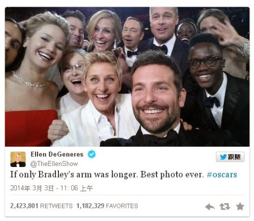 其中,SAMSUNG可說是大贏家!大家對於頒獎典禮上的那張眾星雲集的經典自拍照,應該還記憶猶新吧。典禮進行中,主持人艾倫狄珍妮在會場上拿出三星Galaxy Note3手機自拍,還號召現場眾多知名影星,包括布萊德利庫柏、布萊德彼特伉儷、梅莉史翠普、上屆影后珍妮佛勞倫斯、茱莉亞羅勃茲等大明星一起玩自拍,堪稱史上身價最高的自拍照,在Twitter被轉發超過220萬次。SAMSUNG也因此在本月的排行榜中前進4名,再度進入總排行榜的前10大,到達第7名。