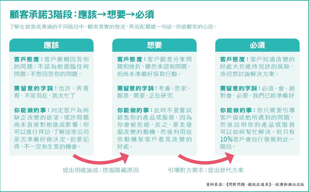 美國銷售績效改進專家保羅‧雀瑞(Paul Cherry)在《問對問題,錢就流進來》中,分析了顧客面對提案時的心態轉折,將顧客做出承諾的過程分成3階段:「應該」「想要」與「必須」,也就是從「無意改變,也不覺得需要改變」,到「想要改變,也知道需要改變,但是拒絕採取行動」,最後客戶「已經準備好要改變,並會接受為此量身訂做的解決方案」。