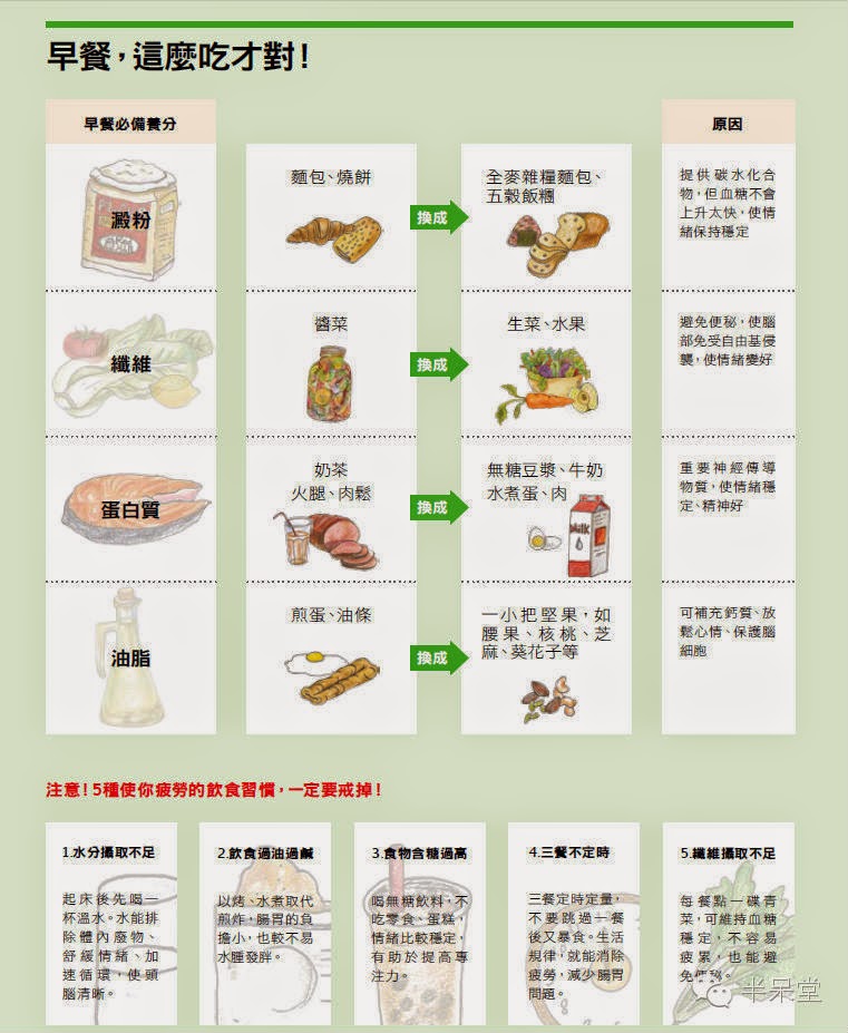 《吃對了,才有好情緒》指出,早餐應包含非精緻澱粉(例如五穀飯)、優質蛋白質(例如蛋、瘦肉)、各色蔬果、牛奶與堅果,才能一整天不疲累。