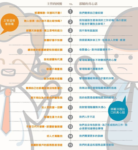 《員工討厭經理人的30個理由》(30 Reasons Employees Hate Their Managers)作者布魯斯‧凱契爾(Bruce L. Katcher)、亞當‧史奈德(Adam Snyder),在深入訪談65間規模介於150~5000人的企業,其中不乏跨國營運的大公司,調查了超過5萬名員工後,歸納出30項員工討厭主管的真正理由!