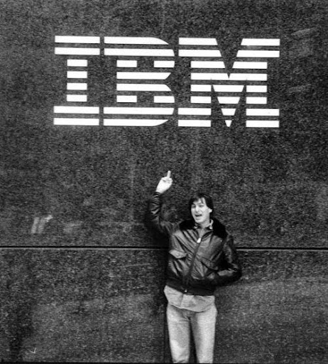 - 身為麥金塔電腦開發小組最早成員之一的Andy Hertzfeld,最近在自己的Google+頁面上,分享了一張賈伯斯年輕時與IBM招牌的合照,這位叛逆的執行長 ,對著頭上的IBM三個大字比了根中指。