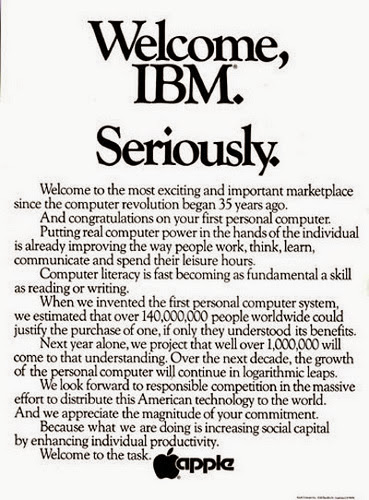 - 1981年時,賈伯斯以「歡迎IBM,真的!」(Welcome, IBM. Seriously.)為主題的平面廣告,調侃IBM決定進軍PC市場,早就慢了蘋果好幾步。後來IBM在PC市場上大展身手,但於2005年時為求轉型,將該事業賣給聯想(Lenovo)。
