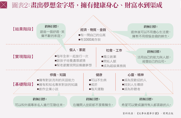 健康、修養、心靈等三類屬於基礎階段,工作、家庭則是實踐階段。如果身體健康、修養好又具備專業,加上心靈滿足,工作、家庭自然會滿,最後一定會在財務上獲得滿足。這個夢想順序絕不能顛倒,如果一開始就以「賺大錢」為目標,可能就會不擇手段或不顧家庭,那就本末倒置了。