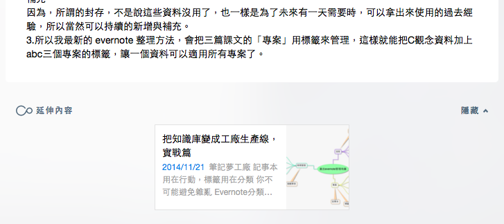 在 Evernote 中有所謂的「延伸內容」功能,可以根據目前這則筆記的關鍵字,找出其他相關的筆記,這個功能在我的工作上很有幫助,有時候我正在組織一個新計劃,就會看到延伸內容推薦我原來幾年前的筆記我曾經想過類似的內容。
