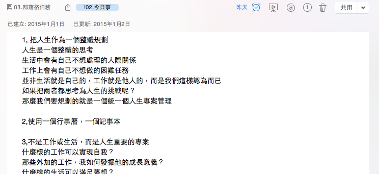 以前學生時代使用Evernote(那時候還是沒有雲端服務的上個世代Evernote),可能就是覺得整理資料、處理論文大綱很方便。但是進入職場後,真正覺得Evernote可以成為(也已經成為)我的最佳工作平台。