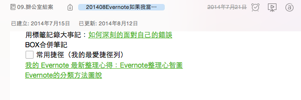 更進一步的,我會善用「記事連結」這個關鍵 Evernote 操作技巧,真的建立起不同筆記之間像是維基百科的連結,讓筆記真正成為工作上有用的知識庫。
