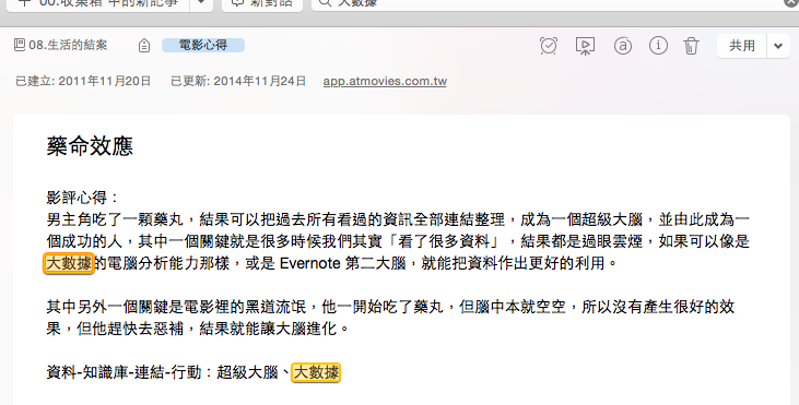 或者更多時候當我靈感枯竭時,我會習慣把正在思考的問題關鍵字丟進 Evernote 筆記找找看,常常會有意外的收穫,例如之前我在搜尋大數據的概念時,找到多年前我看過的一部電影,透過當時寫下的心得,就讓我輕鬆獲得一個點子,能把那部電影連結到我今天工作上要寫的某一篇稿子中。