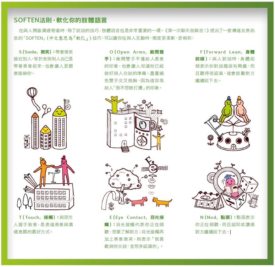 在與人開啟溝通管道時,除了說話的技巧,肢體語言也是非常重要的一環。《第一次聊天就麻吉!》提出了一套傳達友善訊息的「SOFTEN」(中文意思為「軟化」)技巧,可以讓你在與人互動時,態度更柔軟、更親和: