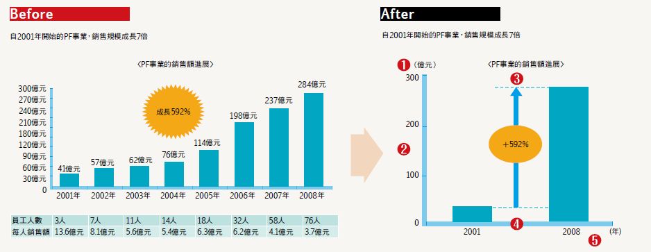 此張投影片要傳達的核心訊息是「自2001年開始的PF事業,銷售規模成長7倍」。試著想想看,有哪些物件移除掉後,完全無損於訊息的傳遞?以下有5個建議(你可以根據右圖1~5做答):