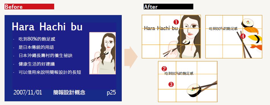 在此先介紹「腹八分」(Hara Hachi bu)這個日文詞,意思是「八分飽」。以下範例中,調整了4個細節、留出空白,提升訊息強度。
