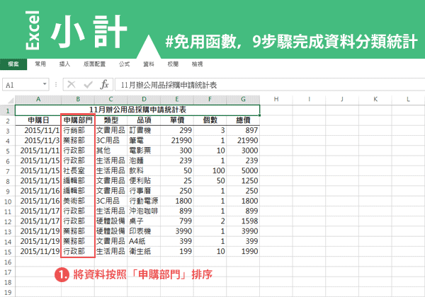 為了方便使用者建立資料的摘要,Excel內建了「小計」的功能,可以幫你把資料分門別類、快速統計,完全不需要用到任何的函數啦!下面以「辦公用品採購申請統計表」為範例來說明,假如想知道各部門請購總金額,我們就請Excel按照申購部門來做分組小計吧。