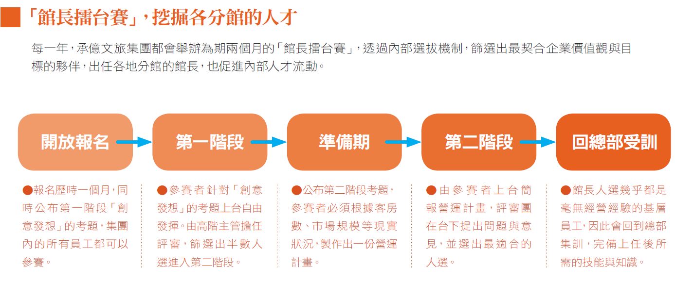 因為,由內部升遷上來的館長,對企業的認同感常遠大於外來的專業經理人;更重要的是,這套甄選機制能讓所有員工看見工作前景,「只要肯努力,人人都是未來的館長」,促發他們的動機和企圖心,也讓領導層級有機會拔擢不少館長遺珠。