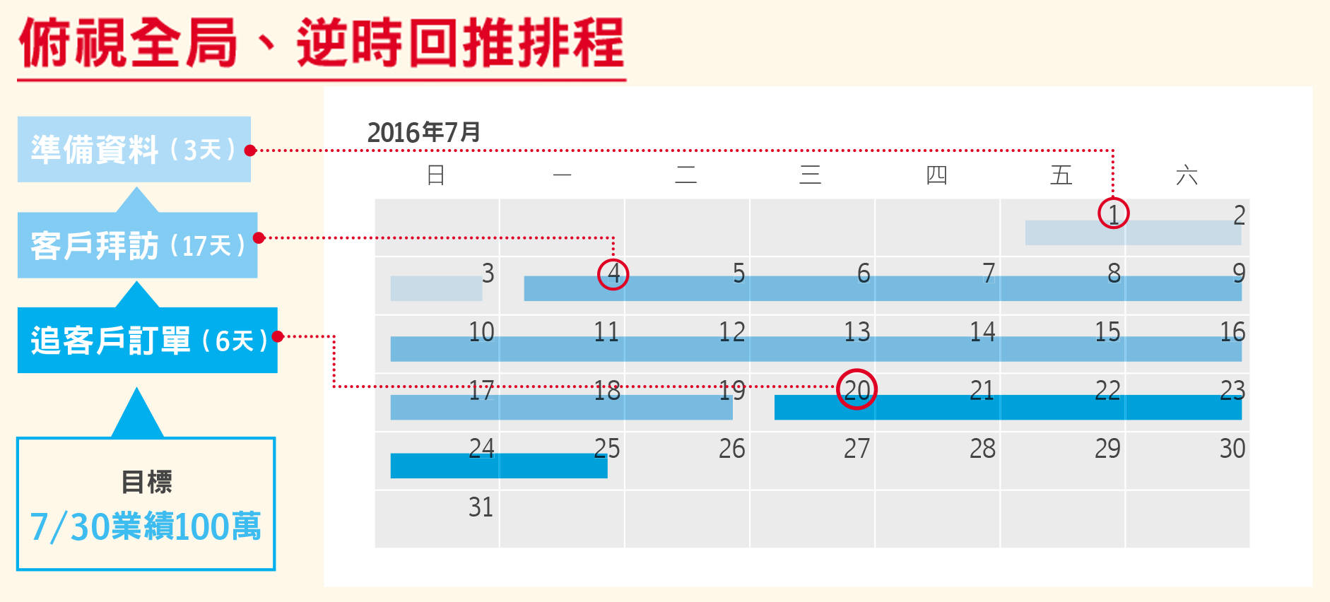 舉例來說,如果目標是做到 100 萬營業額,就要評估如果要達成數字需要有多少客戶下訂單,為了拿到這些訂單,幾號之前要拜訪多少家客戶、要拜訪客戶之前要準備哪些必要的清單或資料,然後這些資料在何時之前要準備齊全。