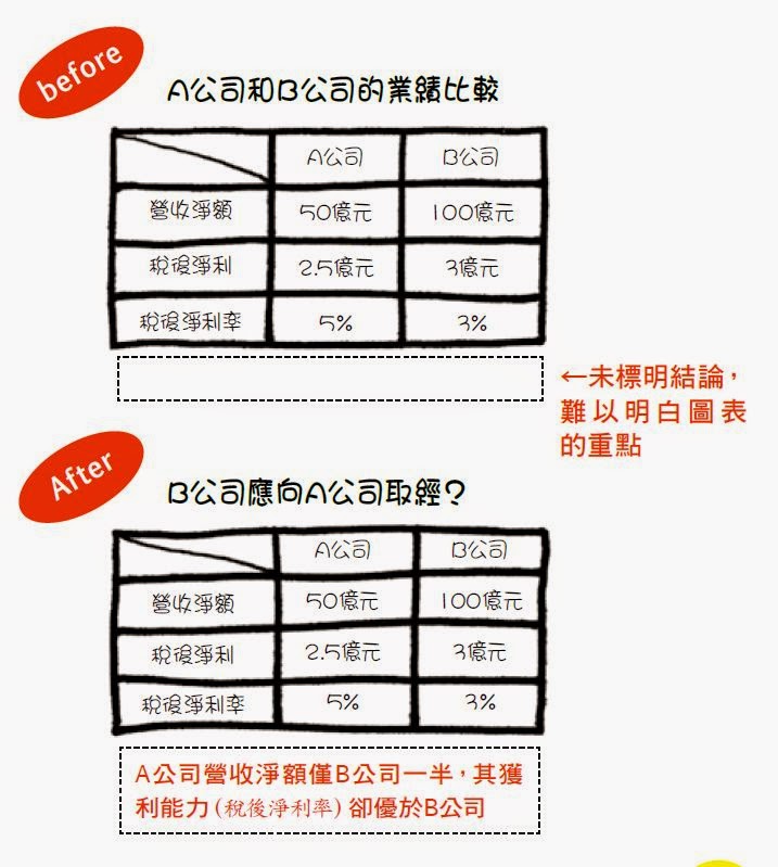 以圖表資料為例,乍看之下B公司的「營收淨額」和「稅後淨利」都優於A公司,所以「B公司應向A公司取經?」的標題,多少能夠勾起讀者的好奇心,之後再於結論處說明個中原由:「A公司營收淨額僅B公司一半,其獲利能力(稅後淨利率)卻優於B公司。」