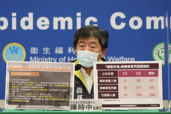 指揮中心今日公布國內新增 39 例 COVID-19 確定病例,陳時中表示:北市三大市場累積229人確診,強調 5 重點管制。
