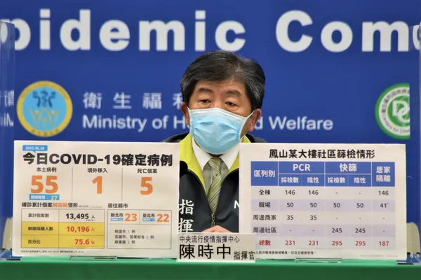 中央流行疫情指揮中心今日公布國內新增 56 例 COVID-19 確定病例,分別為 55 例本土及 1 例境外移入。陳時中:41 萬劑莫德納疫苗今抵台