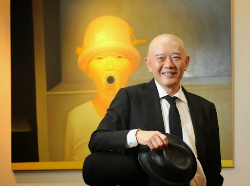採訪結束後,特力集團總裁何湯雄站在女兒為他畫的肖像前拍照。畫中,他身穿白色衛生衣、嘴咬水管,頭上頂著海賊團成員喬巴造型的帽子;眼前,他一身窄版黑西裝配刮得發亮的光頭,彷彿嫌還不夠「飄撇」似地,順手又抄