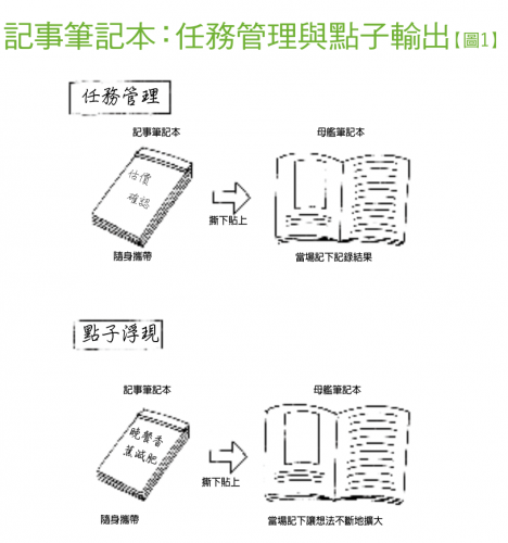 「記事筆記本」的使用,主要可用於「任務管理」與「點子輸出」兩方面(詳見【圖1】)。「任務」(task)是指將該做的工作,以最小單位做分類,記錄於筆記本上。例如在與客戶商談時,突然想起需要向上司做確認,此時可以「向田島部長確認A公司估價案件」這樣的「最小工作單位」記錄於筆記本上。