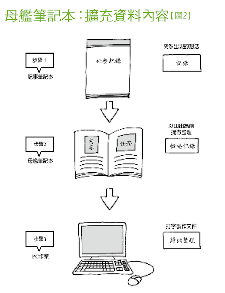因此美崎建議,使用筆記本一定要有如下流程:首先使用記事筆記本記錄片段資料,再利用母艦筆記本擴充資料內容,最後使用電腦整理歸納,再以文件資料模式輸出(詳見【圖2】)。如此一來等於重新寫筆記,把原本凌亂的資料拼湊成有系統的資訊,讓雜亂情報成為強大的工作戰力。