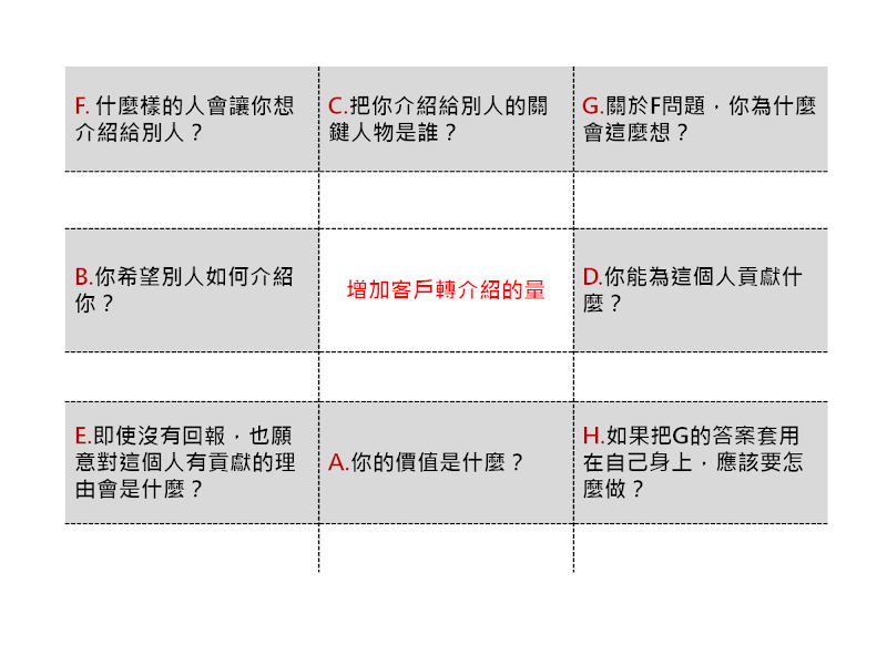 頂尖業務員有個共通特質,就是業績有很大一部分是靠客戶介紹達成的。如果要讓別人幫忙介紹,就要先找到自己值得介紹之處,請按照A~H的順序來思考,找出可能帶進生意的夥伴。平常也可以養成習慣,問問客戶「某某人是怎麼介紹我的?」了解別人眼中的自己,並思考原有客戶中有誰是擅長介紹的人,進一步加深和對方的關係。