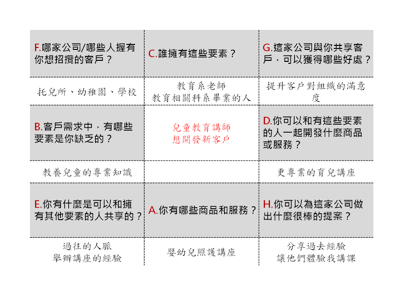 以下是一名兒童教育講師想要開發新客戶,從A~H這8個問題,依序引導自己想出可能的方向: