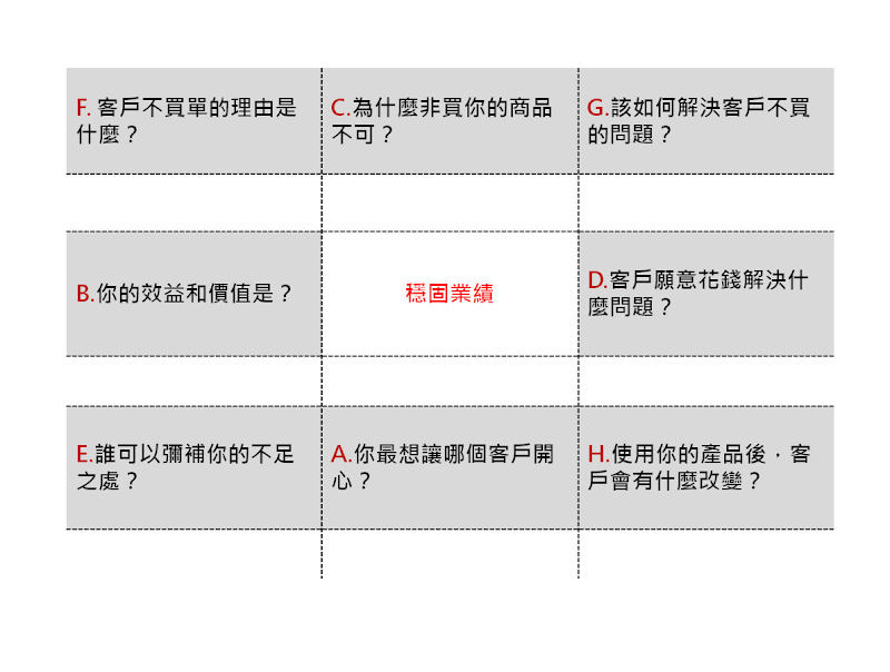 當業績停滯不前,甚至開始下滑,就可以試著回答這張九宮格。一樣要按照A~H的順序來思考,特別注意的是,「B.你提供的效益和價值?」和「D.客戶想花錢解決什麼問題?」兩者答案應該要調整到一致,商品才會暢銷,接下來只要針對顧客不滿的原因發想對策,就可以挽救業績。