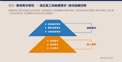 通常主管階層的目標,一般會設定成為他們的關鍵績效指標(KPI),他們有義務和責任將其達成,但這些指標卻通常不適用在一般員工身上,因而要達成組織目標這件事,便產生對立性。然而,從雙塔需求層級模型(參見【圖表】)來看,個人與組織需求雖然具有對立性,但主管必須將其統一起來,使其互為因果。