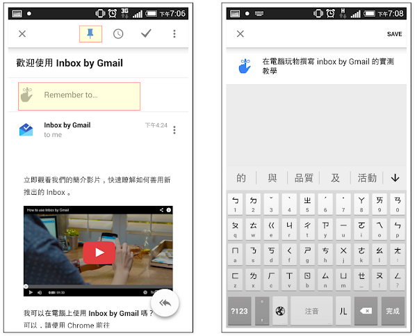 在 Inbox by Gmail 裡,可以把重要的郵件任務加以「釘選」,釘選時可以看到郵件內文上方會出現一個「 Remember to (記得要去做什麼)」的輸入欄位,這裡可以讓用戶隨意填寫筆記備忘。