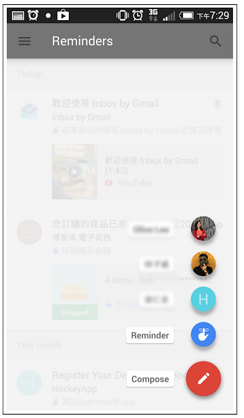 新增郵件時也有小巧思,除了 Google Inbox 採用了 Material Design 的按鈕風格外,當點開按鈕,可以看到彈出氣泡裡是常寄信的連絡人與最近有寄信的連絡人,方便我們更快新增需要的郵件。