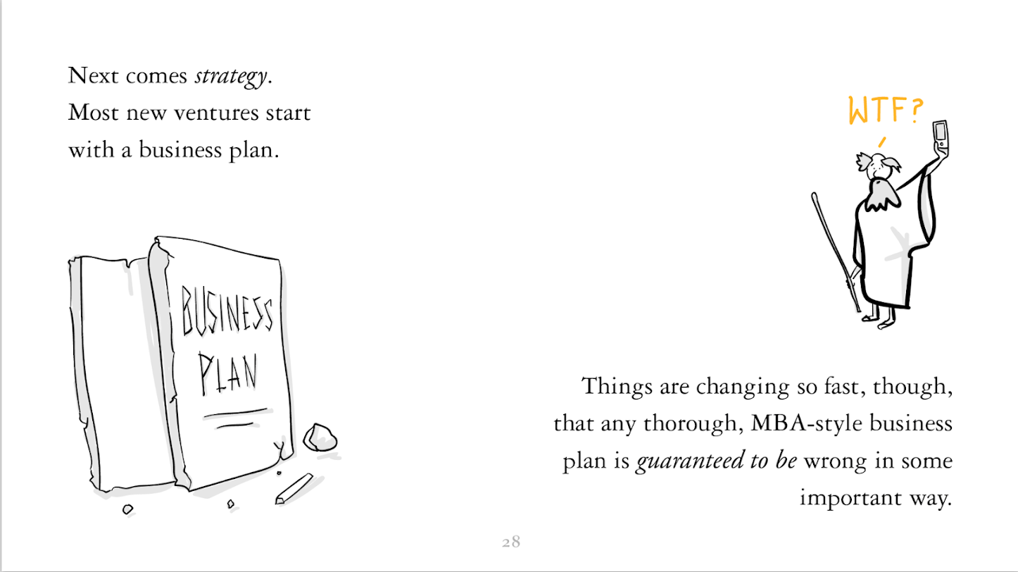 下一步就是策略。大部分的新冒險事業都會作一份商業計畫,但事情變化太快,任何MBA模式的商業計畫在某些重要方面肯定是錯的。
