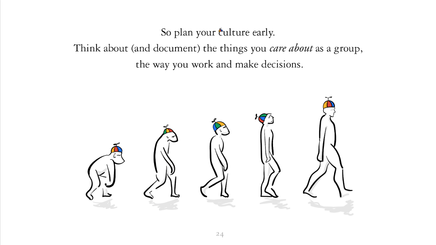 所以請盡早打造你的企業文化,想想(並紀錄歸檔)你在一個團體裡在乎什麼?工作和做決策的方式是如何?