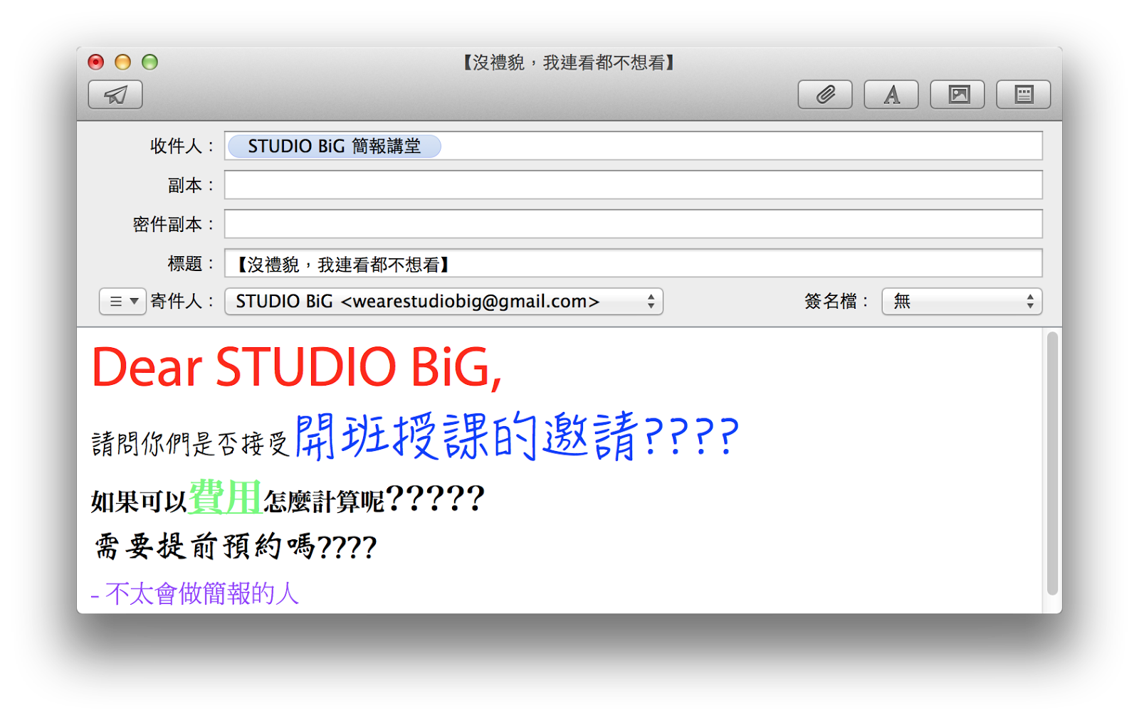 上次跟大家聊到一再修正,「以此封為主」的email習慣讓人傻眼之外,今天要來說說個人最不喜歡,甚至覺得沒有禮貌的email寫法。