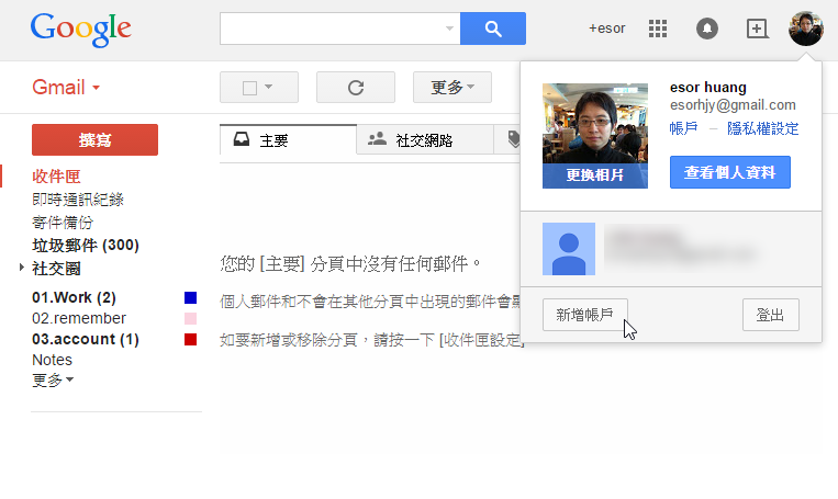 若是另外一種情況,我有多個 Gmail 帳號信箱,並且工作與私人之間常常要切換處理,那麼這時候 Gmail 一樣提供內建的快速切換多帳號功能,讓我們處理不同信箱郵件。