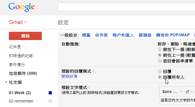 這時候記得到 Gmail 設定中的「一般設定」,在「預設的回覆模式」勾選「回覆所有人」,就能在每次回信時,自動回信給前封郵件裡的所有收信人。