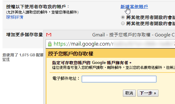 一樣是到 Gmail 設定裡的「帳戶和匯入」,找到「授權以下使用者存取我的帳戶」項目,新增其他帳戶,輸入對方的郵件地址,完成後續的認證,就能讓對方擁有讀取、刪除、寄送我的 Gmail 的權限!