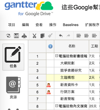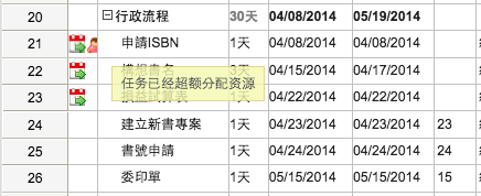 例如當同樣一個人力資源在同一天負責了兩個以上的全日任務時, Gantter 就會出現警告的圖示,通知我們在這樣的專案排程設計上,可能人力分配不當,而超額分配很可能反而讓工作無法完成。