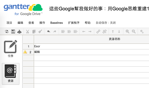 在 Gantter 左方的「資訊」分頁,我們可以自訂這個專案下可以使用的人力、物資資源,自動好資源後,就可以分配到任務清單中。